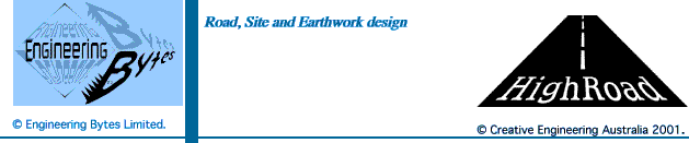 | Creative Engineering title page Landform details Module breakdown |   | The incredible speed of this program allows projects to be designed in minutes and modified almost instantaneously, with full visualisation and quantities for cost information making it invaluable at feasibility stage, comprehensive enough for final design and possessing features to allow the monitoring of costs during construction. Quick reference Overview :- Input the Data. - From a comprehensive list of formats, includng OS or personal survey. Create the digital terrain model. - The survey will be triangulated, taking into account all breaklines, features and contours plotted at the chosen interval. Surveys of up to 5 million points are quite workable. Points and features can be added or edited at any time. Layout the control line. - Click the mouse on intersection points to layout the control line. Clothoidal or parabolic transitions are calculated and shown instantly. There is no limit to the number of control lines/roads in a project. Design the typical sections. - Design any number of typical sections with a range of user definable kerb, pavement and batter types. Nominate design speed and travel lanes to automatically calculate plan transitions and superelevation. Tapering, twisting pavements are easily modified. Layout the profile. - Display the ground profile at any convenient scale and vertical exaggeration. Enter vertical intersection points with the mouse to automatically insertparabolic vertical curves. Nominate the macimum grade to be used, grade to a target, show balanced cut and fills, culverts etc. Click anywhere to show the section at that point. Draw, plan and fine tune. - Display plan, profile, quantities and mass haul diagrams on the screen, together and adjust with mouse to acheive minimum quantities, optimum mass haul diagram and minimum land take. All open windows are instanttly updated. Visualise and present. - Check sight distances or present your design by creating a drive through simulation and 3D images of the construction. Working drawings.- Full working drawings can be set up and printed automatically or can be output to a CAD system. Most formats are supported. Easy to learn. A truly intuitve interface. Use it like a drawing board. Learning to drive HighRoad will take minutes, rather than weeks. The speed and ease with which you can operate these programs will amaze you. more |   | |